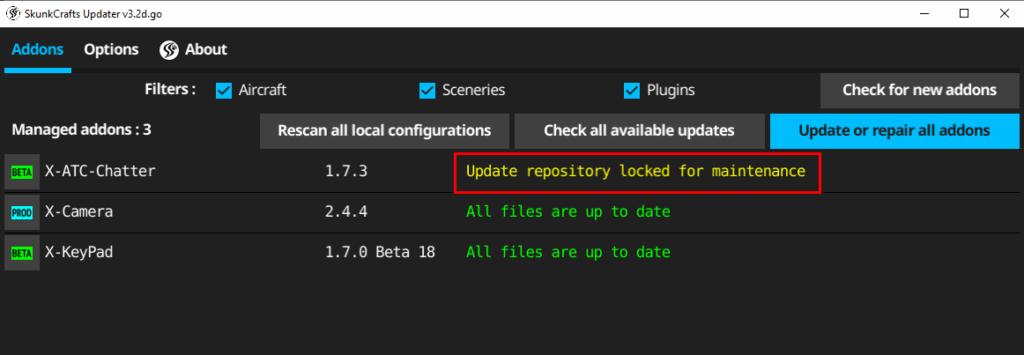 We are now using the SkunkCrafts Standalone Updater to update X-Camera and X-ATC-Chatter to the latest production releases or active open beta versions. You must install the standalone updater version v3.2d.go or above.